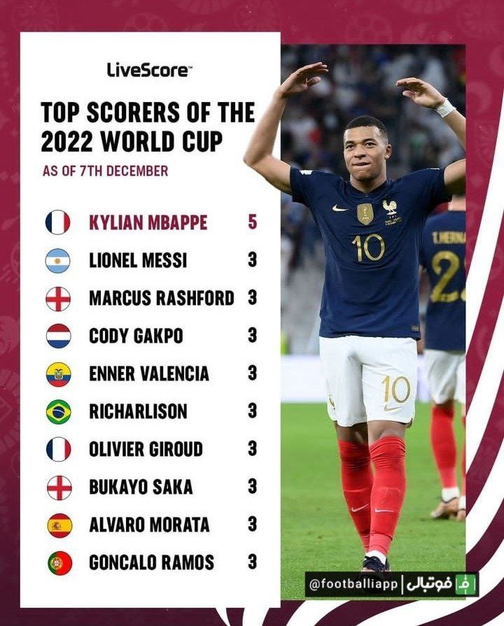 فهرست نهایی گلزنان برتر جام جهانی ۲۰۲۲ با صدرنشینی کیلیان امباپه، ستاره تیم ملی فرانسه، بسته شد. رقابتهای این دوره از جام جهانی با برگزاری دیدار نفسگیر و مهیج بین فرانسه و آرژانتین در ورزشگاه لوسیل به پایان رسید؛